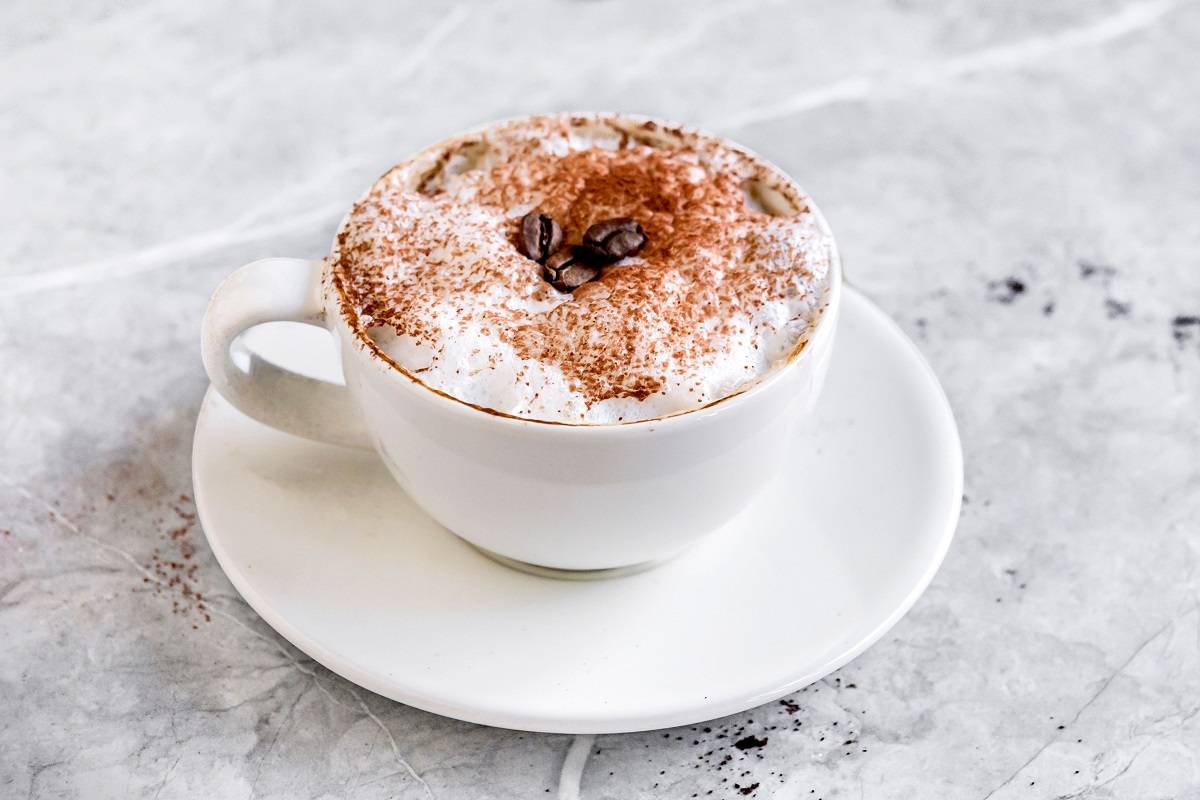 Оставшаяся молочная пена выкладывается на поверхность кофе в виде шапки. Для любителей пряности на молоко можно насыпать немного корицы.