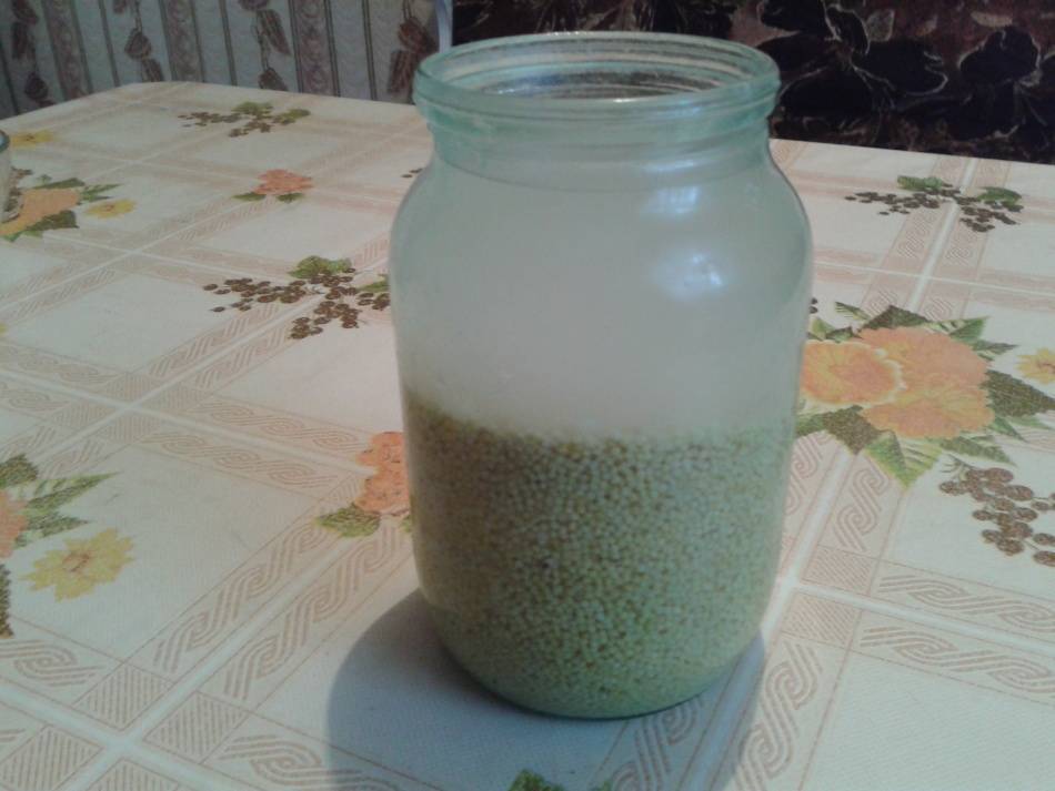 Поместить пшено в 3-литровую банку, залить 2 стаканами теплой кипяченой воды и три минуты очень энергично взбивать руками. Полученную белесую массу пить без всяких ограничений.