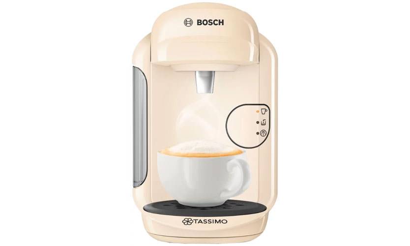 Кофемашина капсульного типа от известного немецкого бренда всего за 1990 рублей. Красивый дизайн, цвет — белый, бежевый, красный, чёрный. В ней приготовляют из капсул Tassimo три разновидности напитка — капучино, эспрессо, латте макиато. Быстро доводит до готовности за счёт мощности 1300 Вт. Объём в два раза меньше, чем у Melitta Easy – 700 мл. Настраивается регулировка порции кипятка, контролируется крепость кофе. Декальцинация автоматическая. Лоток для сбора капель легко снимается и моется. Кроме кофе, можно сделать чай, горячий шоколад. Система считывания штрих-кода с капсулы интеллектуальная, распознаёт тип напитка и выбирает технологию варки. Подставку можно регулировать по высоте. Уровень воды в бойлере подсвечен светодиодным индикатором.