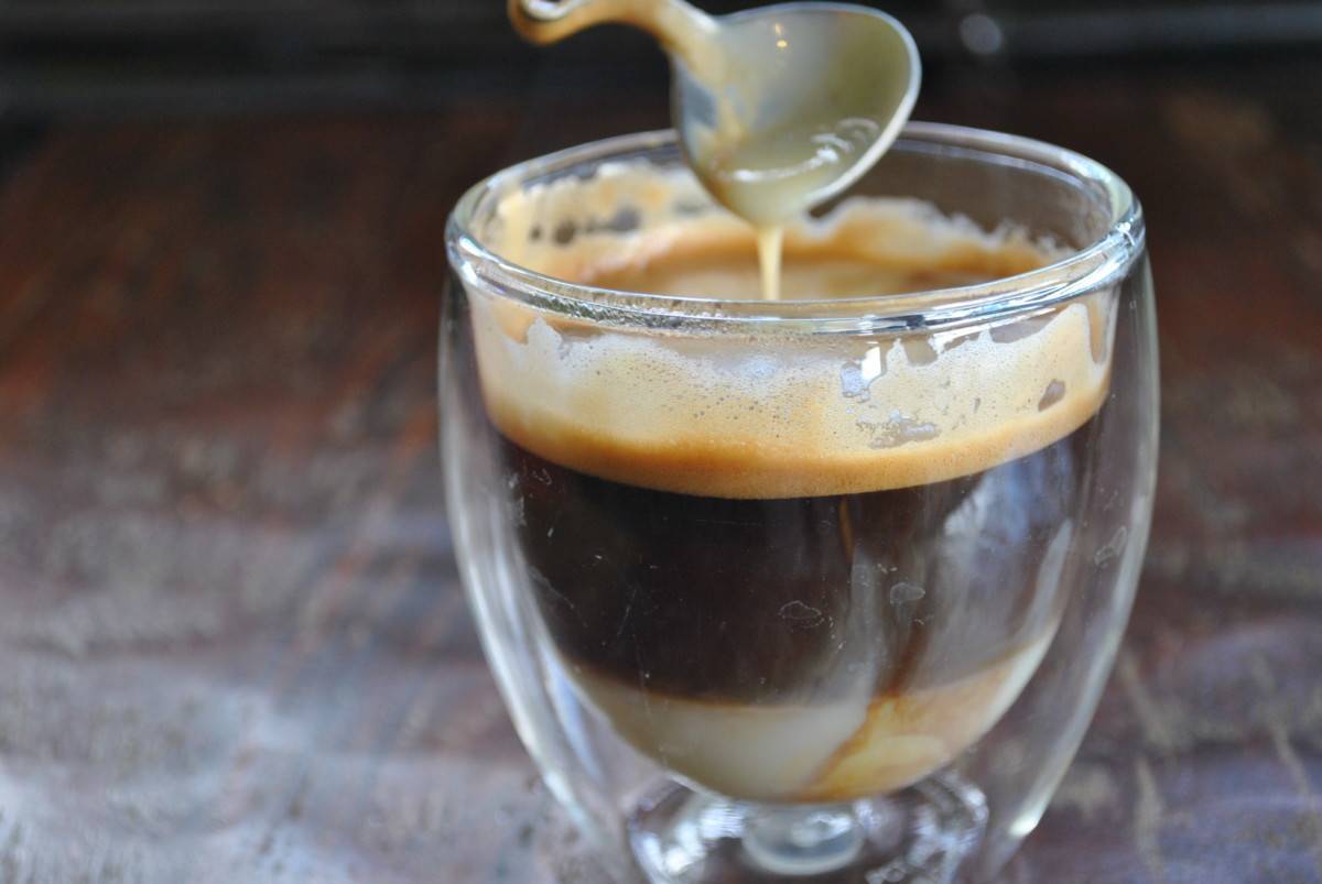 Эспрессо размешивают или даже взбивают с сиропом, а затем добавляют молоко.