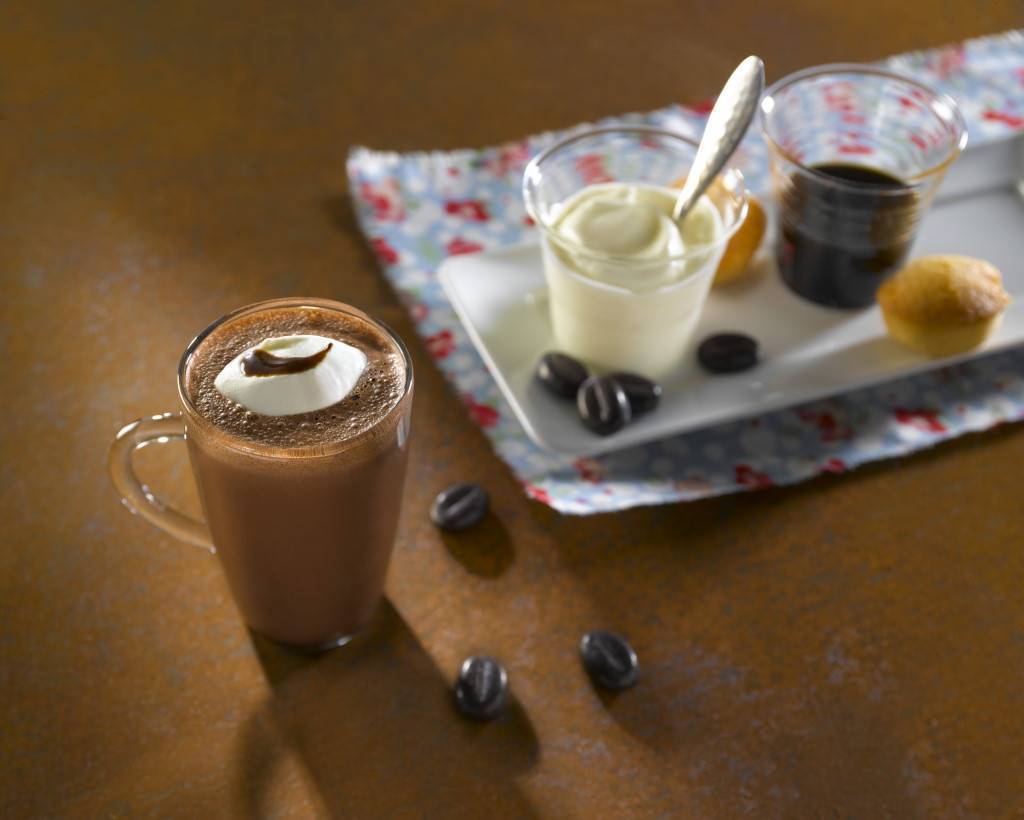Смешайте жаркий эспрессо с шоколадным сиропом, пломбиром и теплым молоком. Отлично перемешайте напиток. Он употребляется прохладным. Дополнят композицию взбитые сливки.