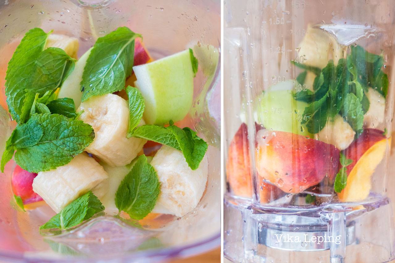 В смузи из фруктов тоже положим банан, но замороженный. Он еще сильнее охладит и освежит напиток. Как и мята, добавляем и ее листья, и воду.