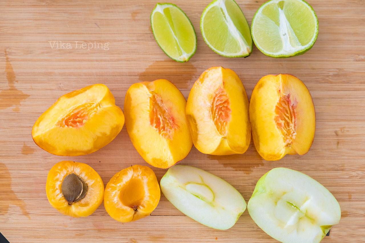 В чашу блендера кладем персик, абрикос и яблоко Гренни Смит. Можно взять и любое другое кислое зеленое яблоко, например, Симиренко. Выжимаем сок лайма. Это важный ингредиент. Лайм можно добавлять в любой смузи — везде он будет только усиливать и комплиментировать вкус. И не только десерты и смузи в выигрыше от лайма, но и многие обычные блюда, особенно из рыбы.