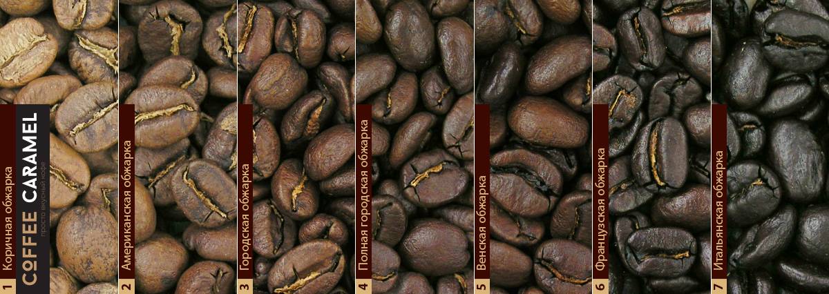 - По способу обжарки. После того, как с зернами проводятся определенные манипуляции, сырье нуждаются в обжарке. Она бывает нескольких видов: слабая, средняя, сильная, особо сильная.
