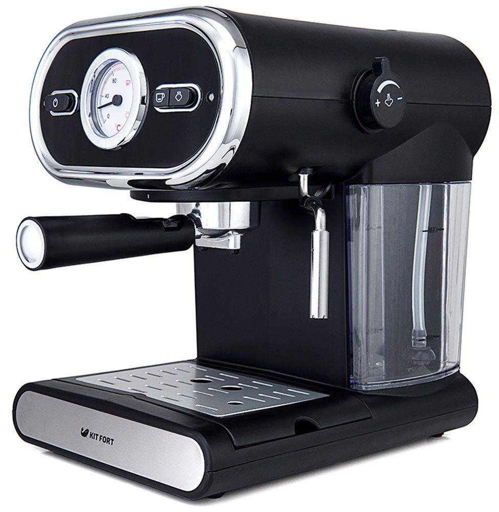 Рожковая кофеварка от российского производителя. Это классическая, довольно простая модель с удобным управлением. Приготовить любимый напиток можно нажатием всего одной кнопки. Объем порций при этом можно отрегулировать вручную. Давление здесь стандартного уровня (15 бар). Рожок выполнен с применением технологии «Perfect Brewing», благодаря чему молочная пенка получается густой и пышной. «VITEK VT-1522 BK» оснащена автоматическим капучинатором. Корпус выполнен из нержавеющей стали и пластика. Объем резервуара для воды составляет 1,4 л. Средняя стоимость «VITEK VT-1522 BK» – 15 905 руб.