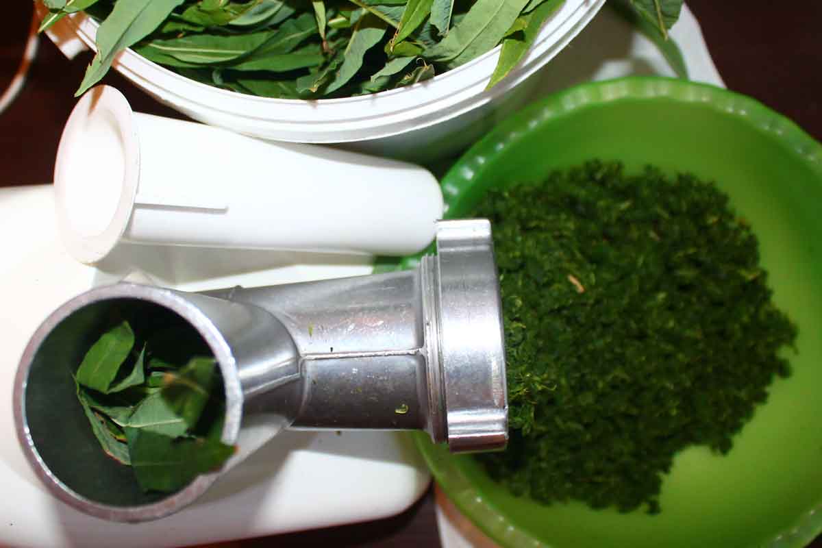 3. Разделите сырье (верх растения и листья) на две кучки. Из одной выдавить сок с помощью соковыжималки. А вторую положить в керамическую посуду, вылить сок, придавить тяжелым предметом (15 кг). Оставить на трое суток и обсушить при 90 градусах.