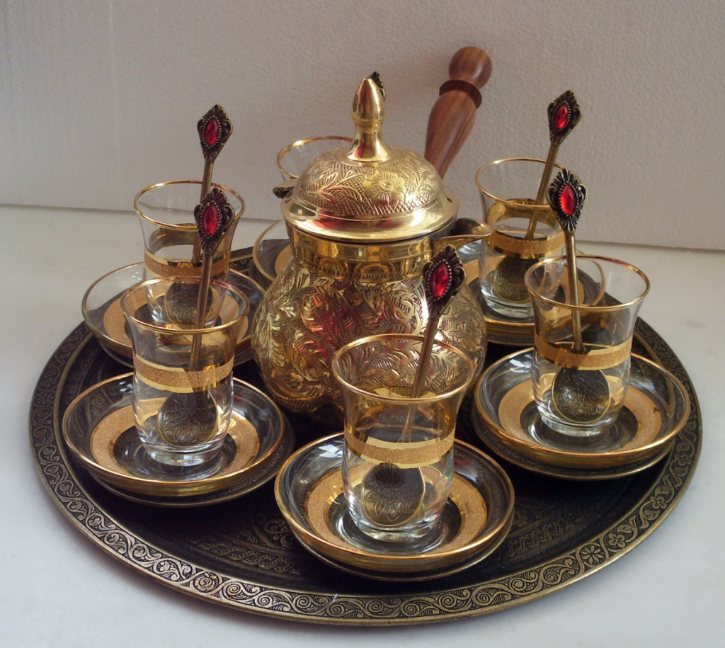 Настоящий турецкий чайный сервиз, конечно же, не может обойтись без этих национальных чашечек. Помимо них, в набор входят блюдца под каждый армуд, ложки, широкий поднос и чайник. Достаточно часто к бокалу прилагается подстаканник, чтобы его было удобнее держать.
