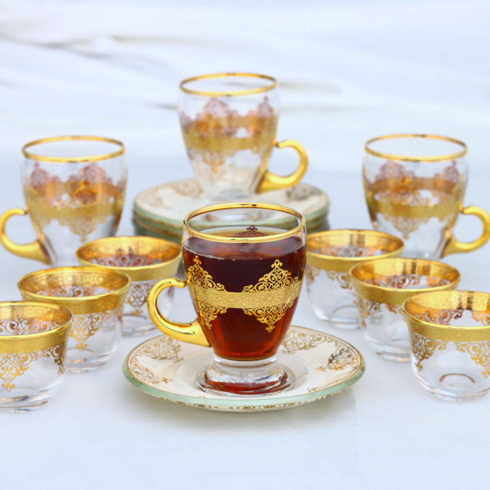 Для обеспеченных людей предлагаются роскошные модели из настоящего золота или серебра. Отличной альтернативой стеклу является хрусталь с красивыми узорами. Объём стаканов совсем небольшой – 100 мл, этого вполне достаточно, чтобы успеть выпить напиток во время разговоров, а потом долить ещё. Порой за одну чайную церемонии турки могут распить 15 порций горячего чая.