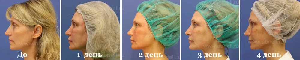 Изменения, которые претерпевает кожа, Вы можете видеть на фотографиях ниже. Отек после контурной пластики спадает в течение 3 дней. На протяжении 1-2 дней после фракционного омоложения наблюдается краснота. На 3-ий день образуются корочки. На 4-ый день корочки активно отшелушиваются. Затем на 6-7 день они отходят, кожа становится гладкой и приятной на ощупь, однако ее цвет сохраняет неоднородность. Через 10-14 дней кожа приобретает ровный оттенок.